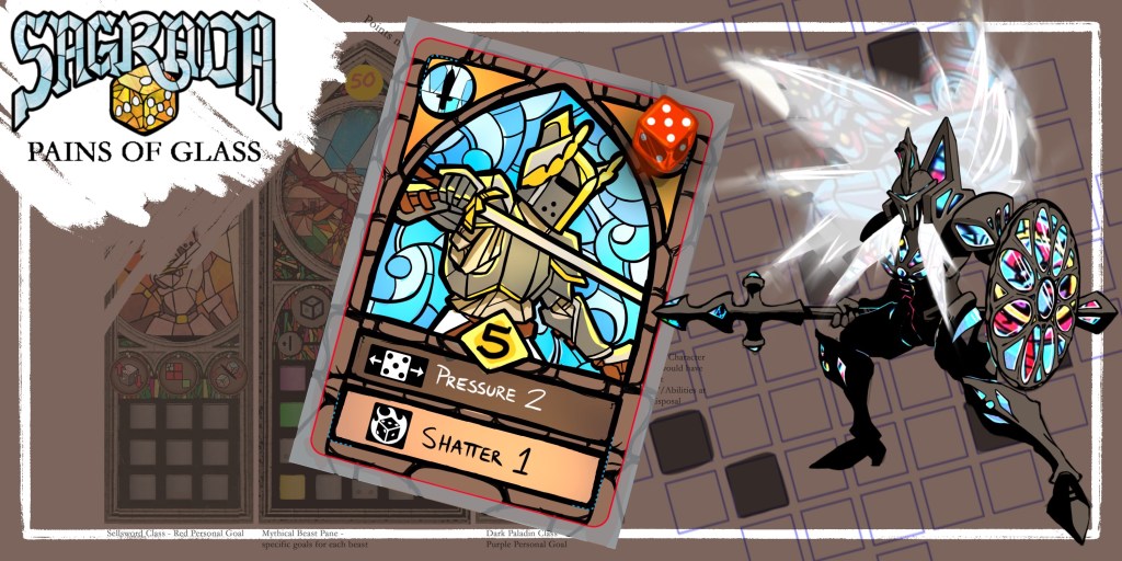 The second is Pains of Glass. This is a dice laying game meant as a narrative spinoff to SAGRADA by Floodgate Games. It’s not affiliated at all with Floodgate, the branding below was just for flavor, but our game uses mechanics inspired by the excellent dice set collection game. The main component that will set our game apart is the unique battle mechanic, coupled with what we’re calling “Pressure” that is applied to each shard of glass placed in the Pane.