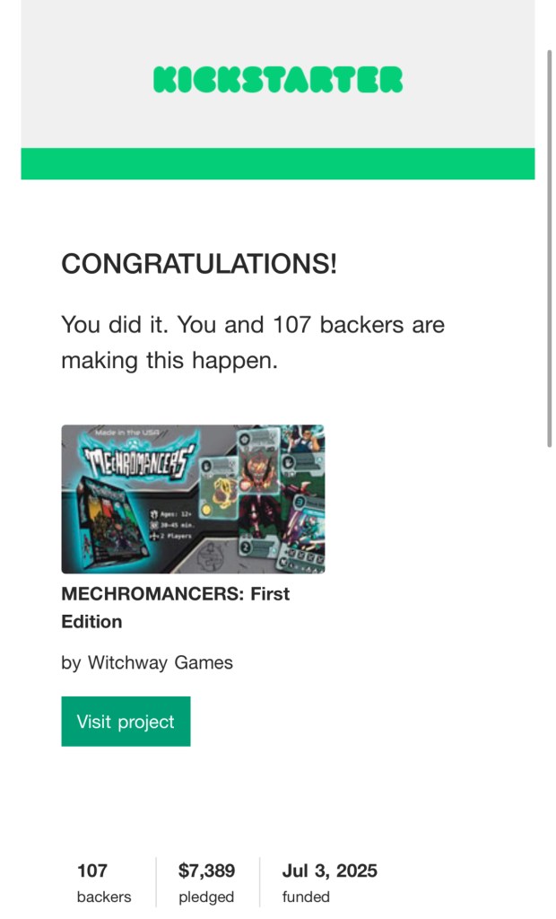 - In June/July we successfully funded a Kickstarter Campaign for our flagship game, MECHROMANCERS: