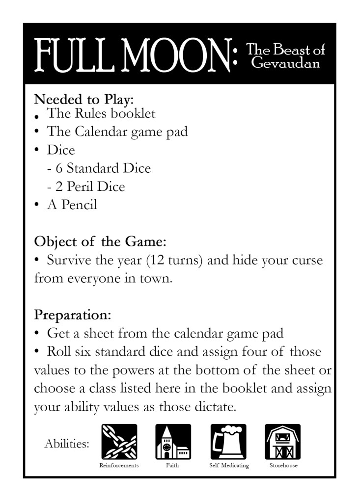 On this page you’ll find a gallery of the rules, along with a printable Calendar page that is used for the game.