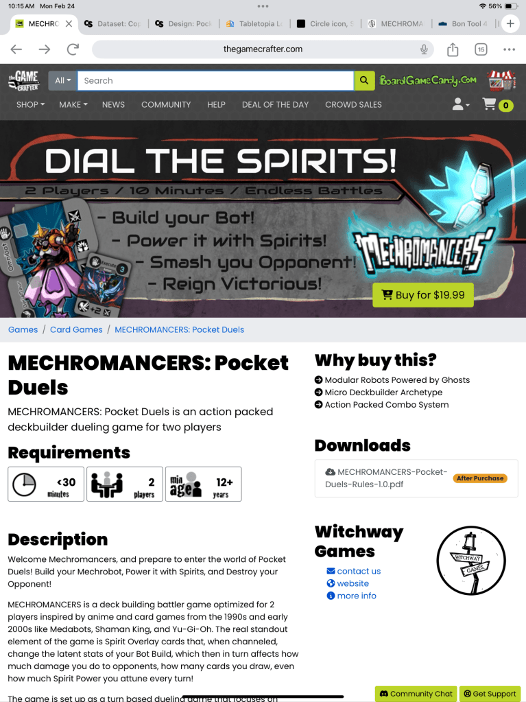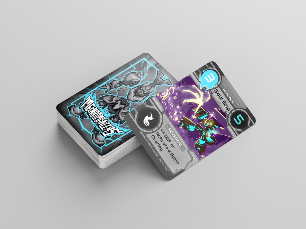 MECHROMANCERS is a deck building battler game optimized for 2 players inspired by anime and card games from the 1990s and early 2000s, and is thematically a combination of shows like Medabots and Shaman King. The real standout element of the game is Spirit Overlay cards that, when channeled, change the latent stats of your Bot Build, which then in turn affects how much damage you do to opponents, how many cards you draw, even how much Spirit Power you attune every turn!